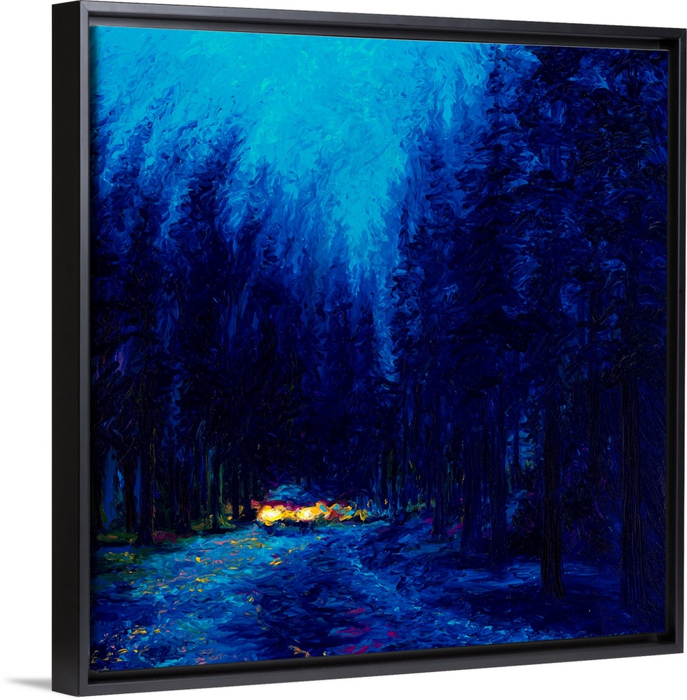 <p>Brightly colored contemporary artwork of a road in redwoods at night.</p>