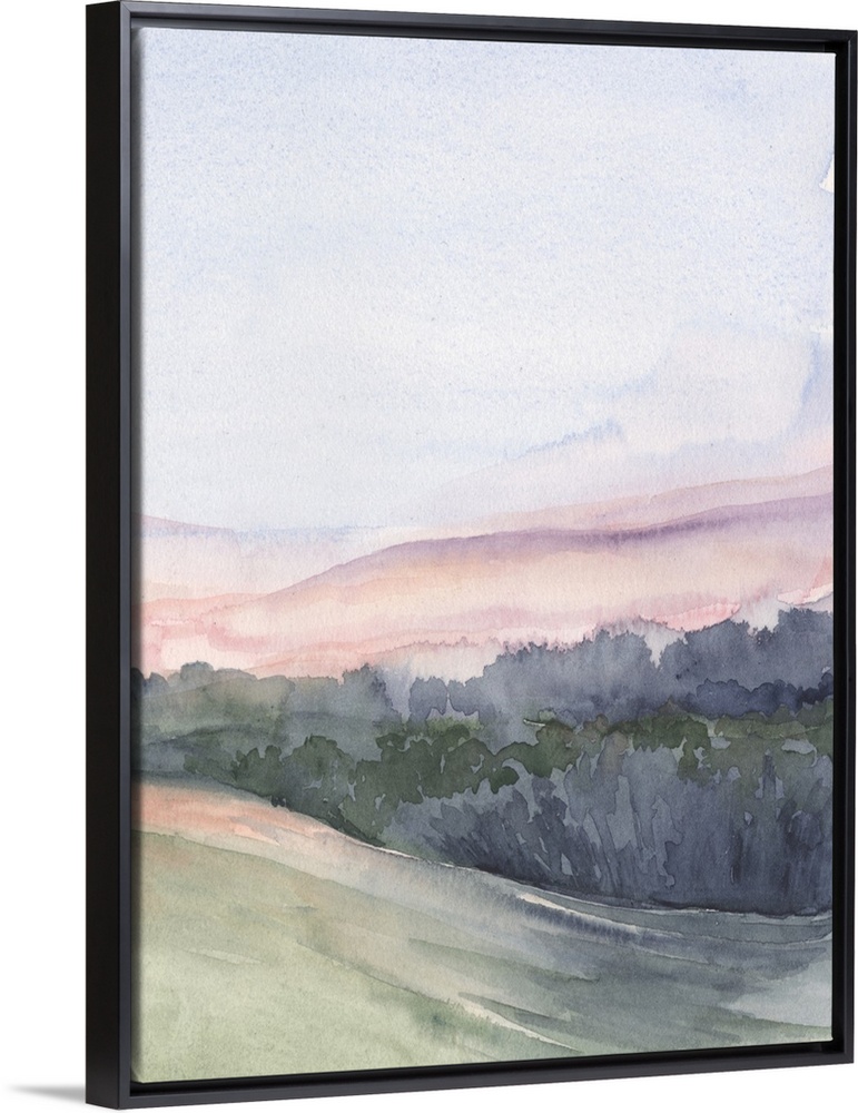 <p>Vertical watercolor landscape of rolling hills of pink, green and blue, lined by trees with a blue sky.</p>