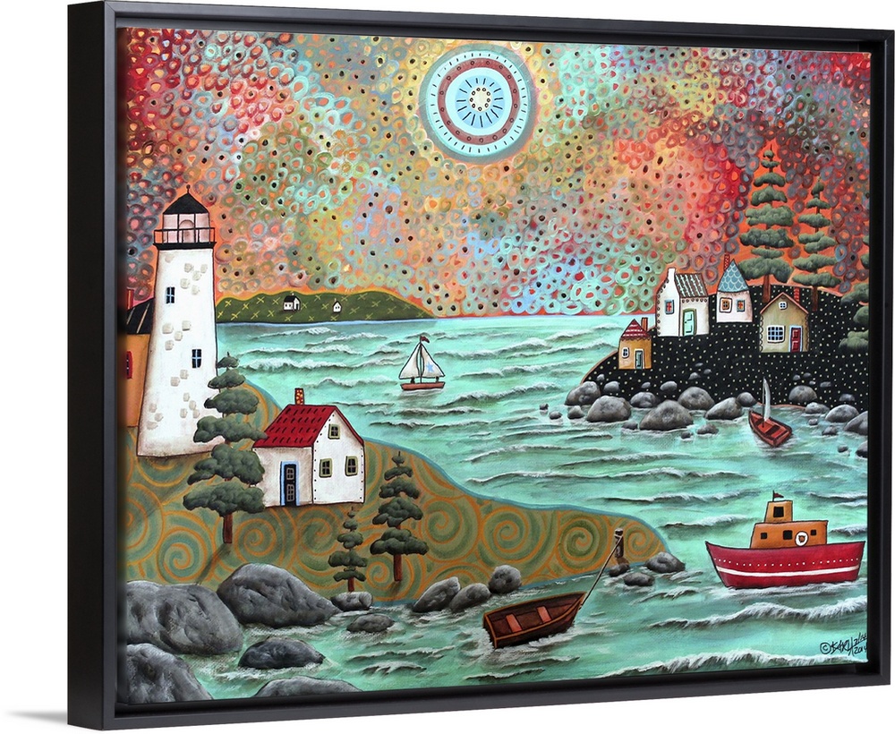 <p>Contemporary painting of a coastal scene with a lighthouse and boats.</p>