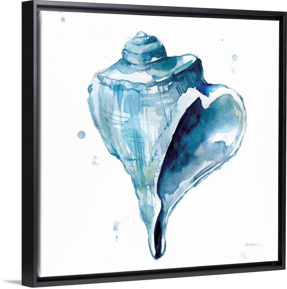 <p>Square watercolor painting of a conch shell made in shades of blue with hints of green on a white background with a little bit of paint splatter.</p>
