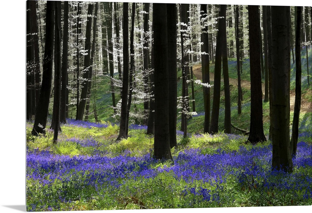 <p>A photograph of an idyllic dense forest scene with purple flowers on the ground.</p>