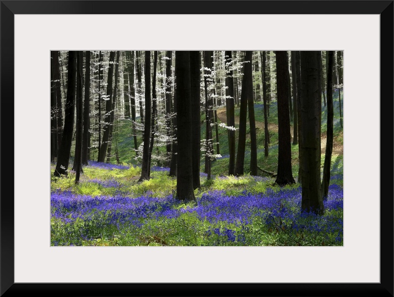 <p>A photograph of an idyllic dense forest scene with purple flowers on the ground.</p>
