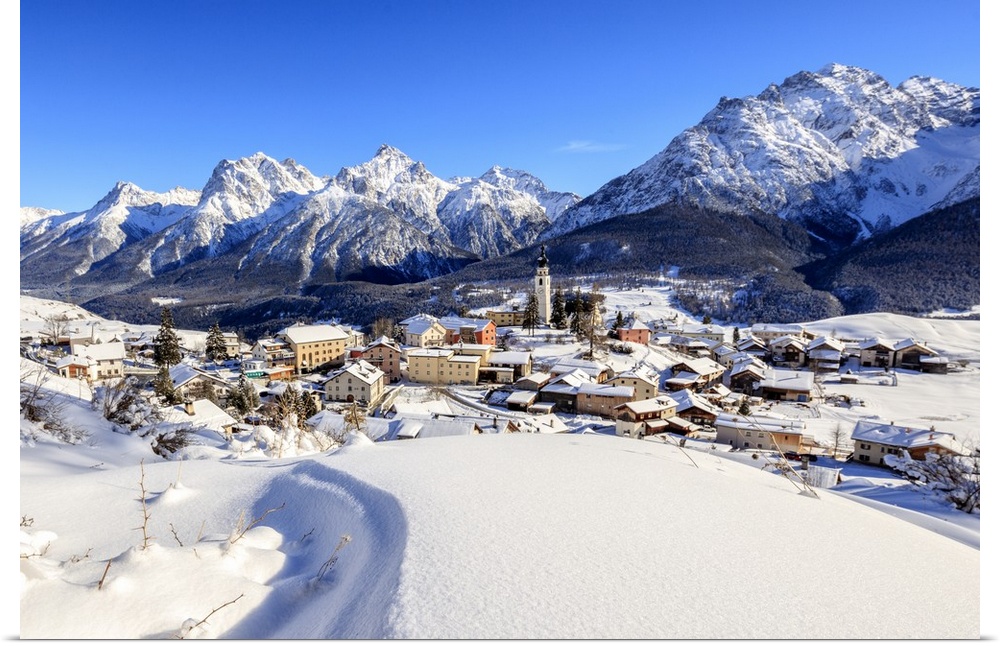 <p>Blue sky on the alpine village of Ftan surrounded by snow, Inn district, Canton of Graubunden, Engadine, Swiss Alps, Switzerland, Europe</p>