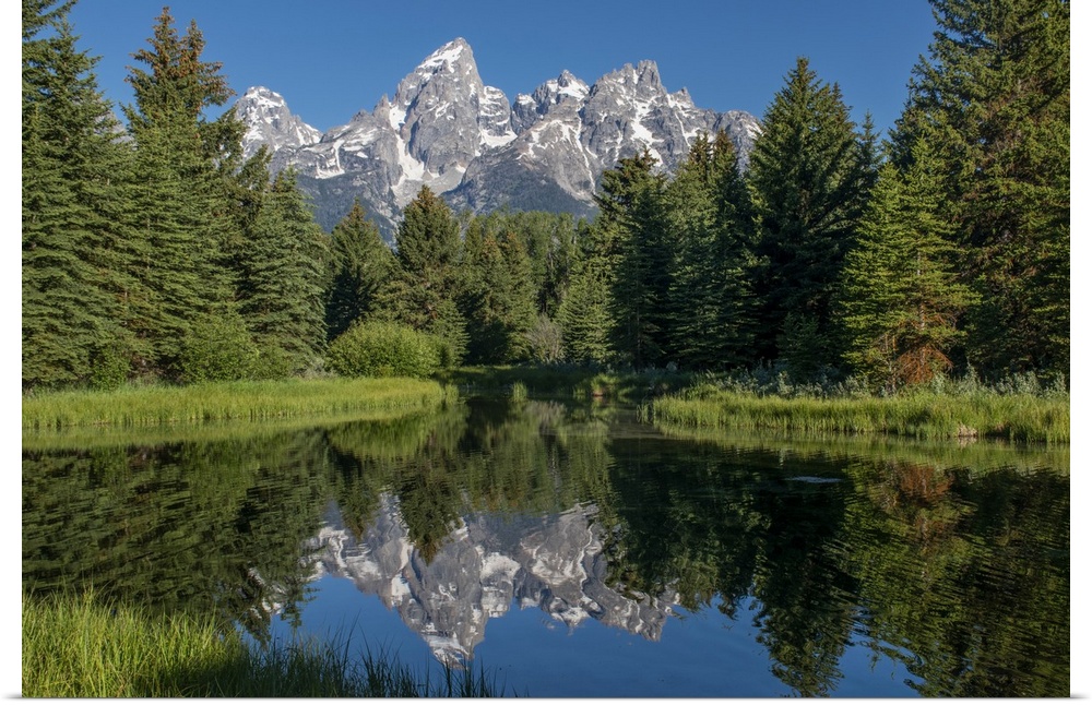 <p>Blue spruce trees and the Grand Tetons, Schwabacher Landing, Grand Teton National Park, Wyoming, USA.</p>