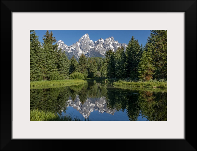<p>Blue spruce trees and the Grand Tetons, Schwabacher Landing, Grand Teton National Park, Wyoming, USA.</p>