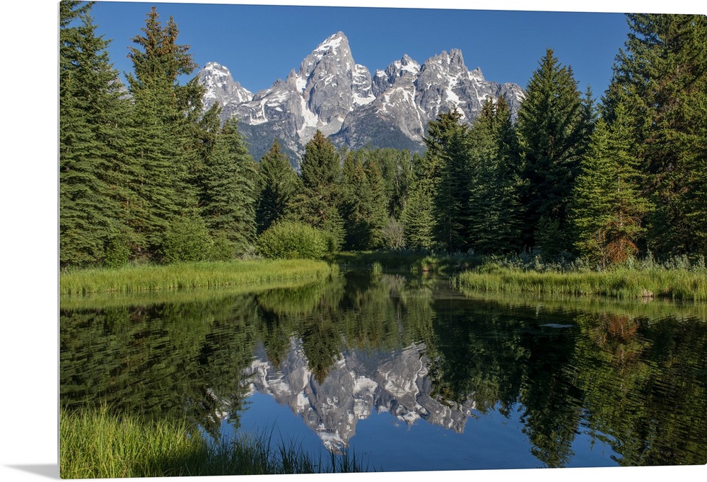 <p>Blue spruce trees and the Grand Tetons, Schwabacher Landing, Grand Teton National Park, Wyoming, USA.</p>