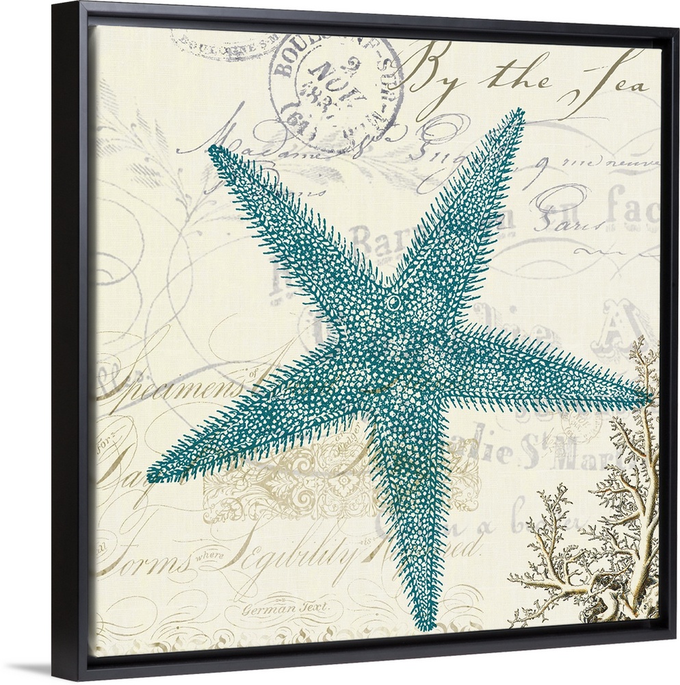 <p>Artwork of a blue starfish against a beige background with a postage stamp and script written on it.</p>