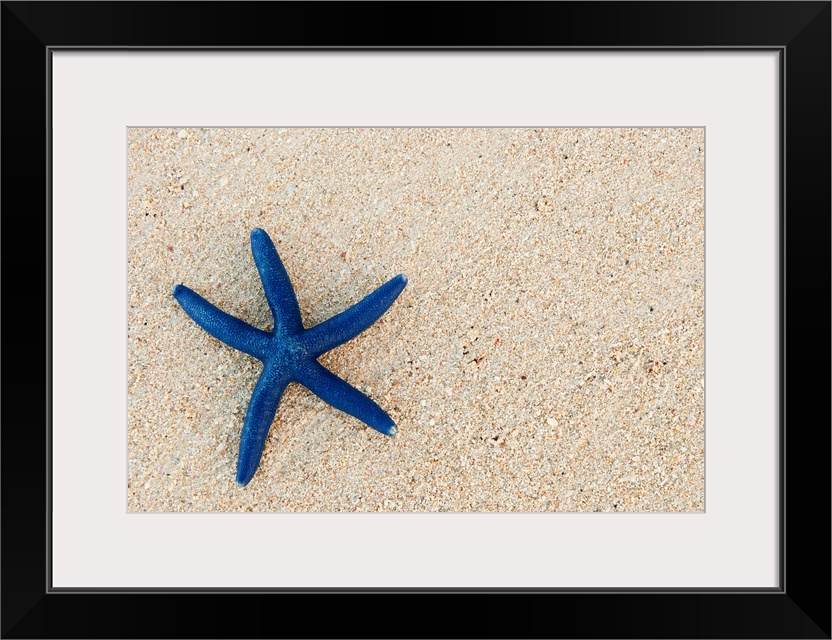 <p>A single starfish is photographed laying on the sand and is skewed to the left of the picture.</p>