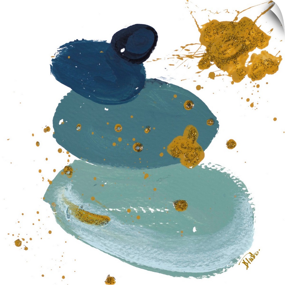 <p>Abstract artwork featuring thick brush strokes in shades of blue with gold color splatters and speckles throughout.</p>