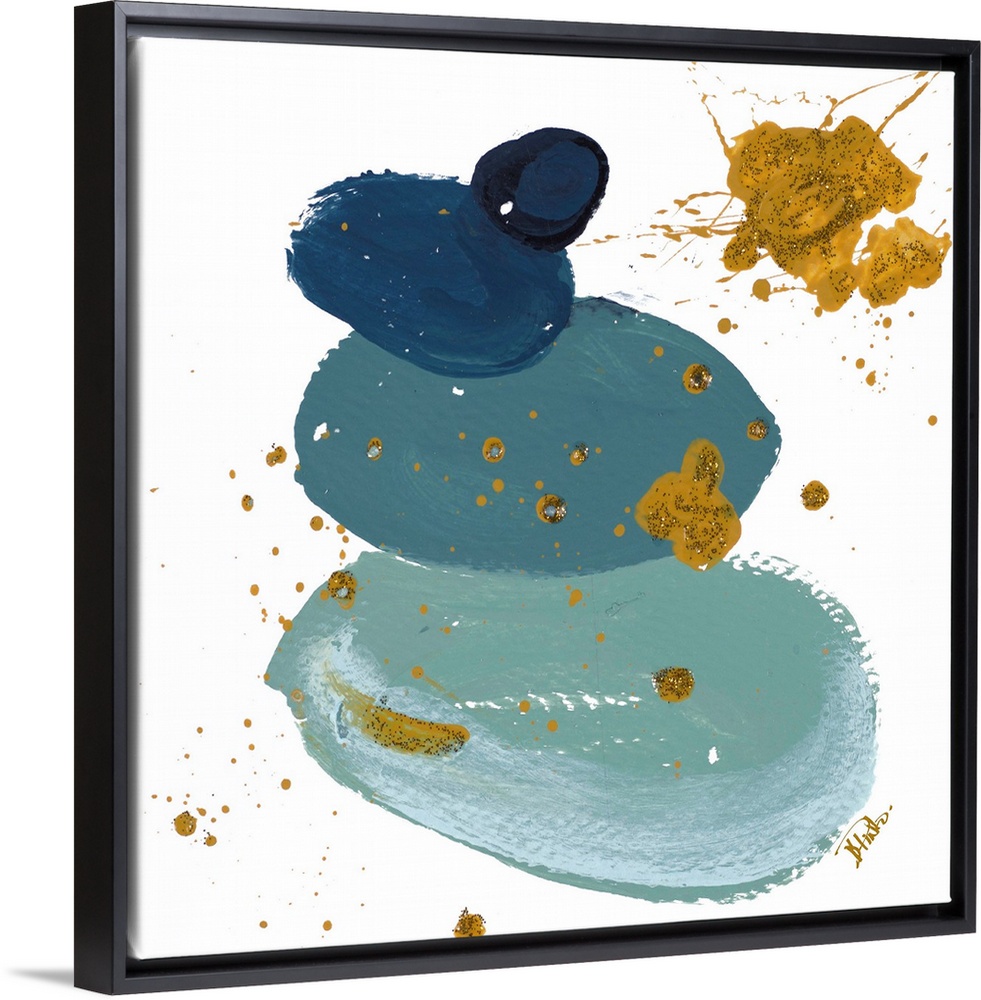<p>Abstract artwork featuring thick brush strokes in shades of blue with gold color splatters and speckles throughout.</p>