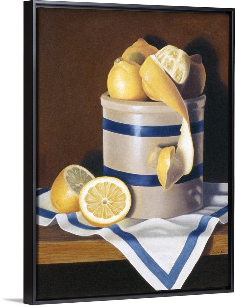 <p>Contemporary vivid still-life artwork of lemons sitting in a white and blue striped ceramic container.</p>