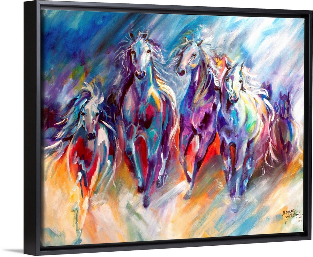 <p>A colorful abstract painting with a herd of horses in full gallop.</p>