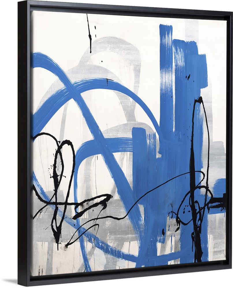 <p>Contemporary abstract painting of a neutral background with blue and black exaggerated lines.</p>