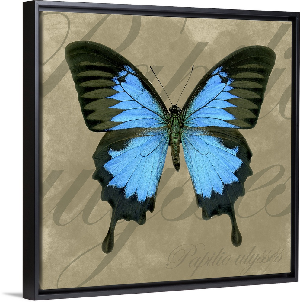 <p>This decorative accent for the living room or bed room is a butterfly on a neutral textured background and the insectos scientific name written in elegant script.</p>