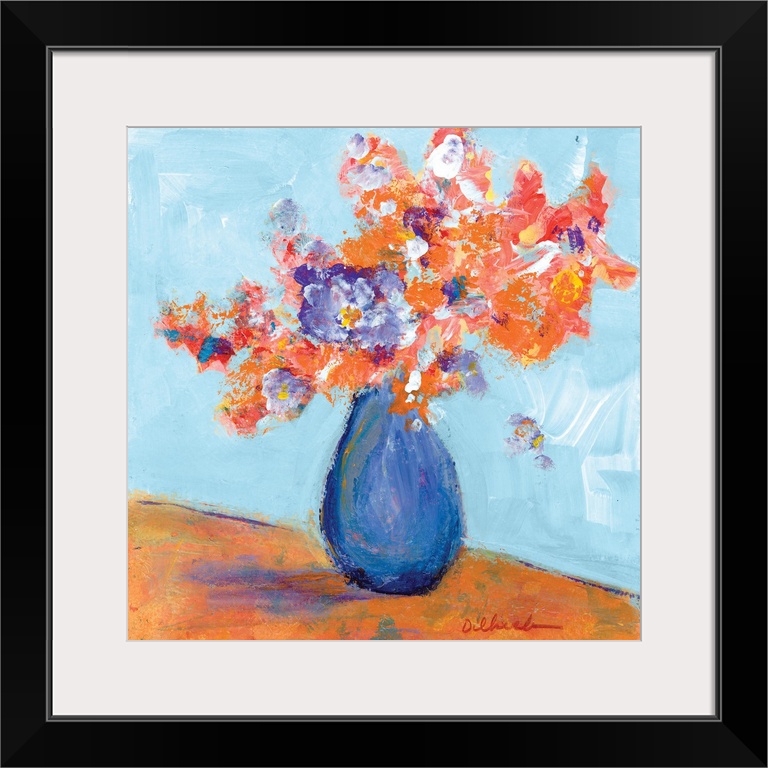 <p>Square painting of a bouquet of flowers in a blue vase.</p>