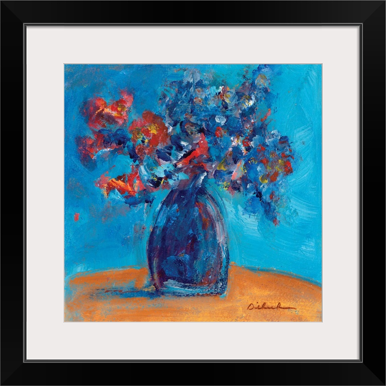 <p>Square abstract painting of a bouquet of flowers in a blue vase.</p>