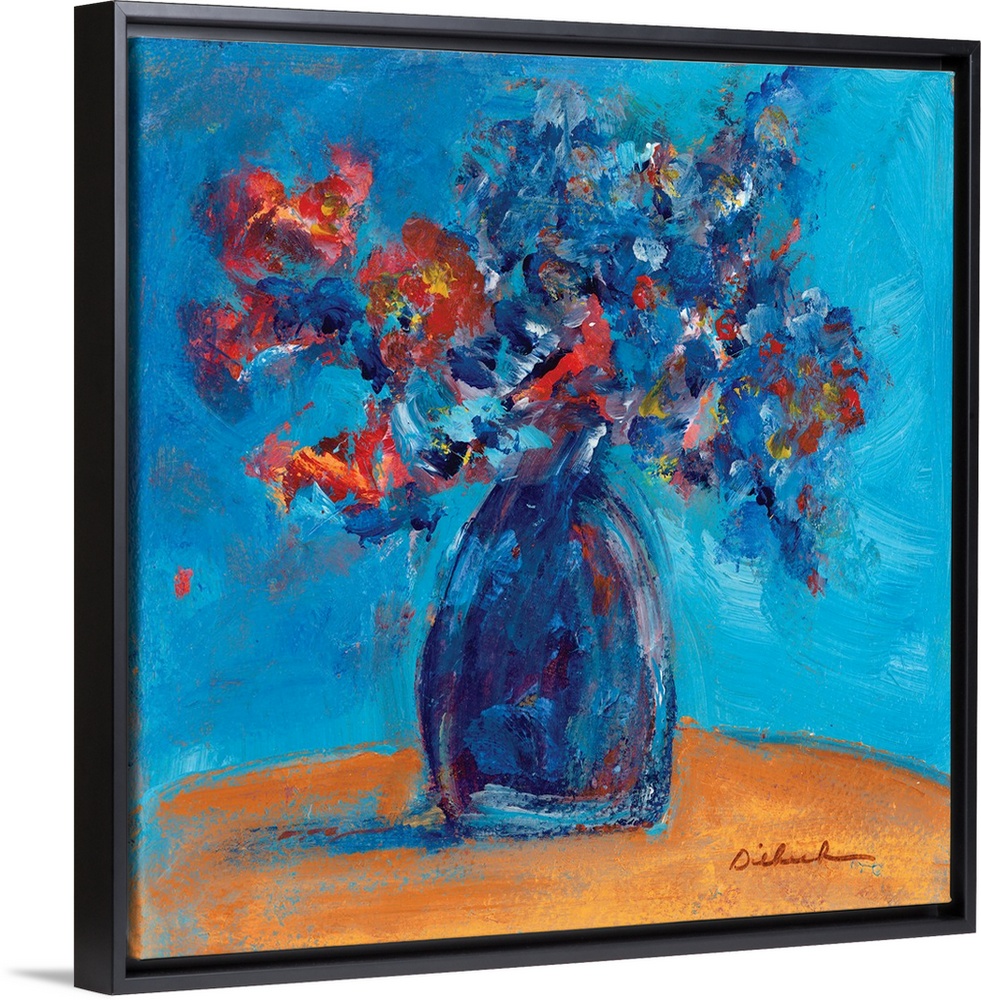 <p>Square abstract painting of a bouquet of flowers in a blue vase.</p>