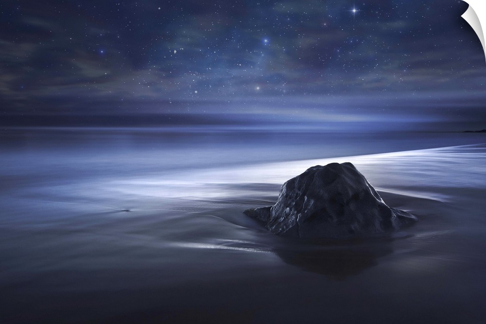 <p>A rock on the beach in sand which appears smooth, under a starry night sky.</p>