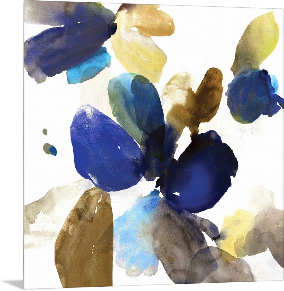 <p>Abstract watercolor artwork of organic blue and gold shapes on cream.</p>