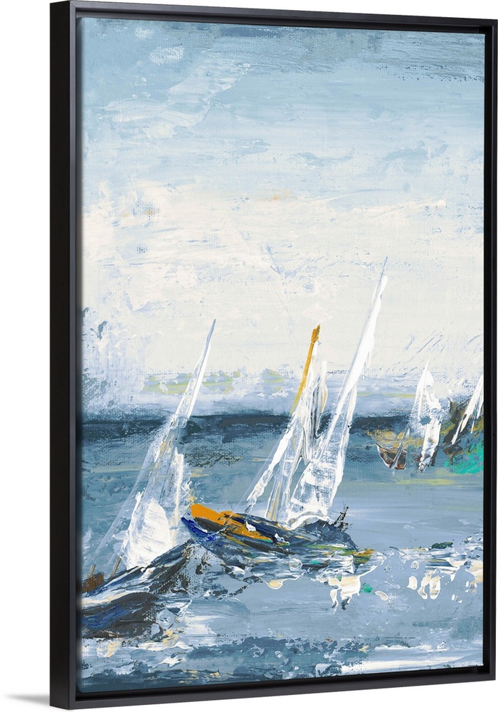 <p>Contemporary painting of sailboats in the middle of the ocean with rough waves and visual paint texture.</p>