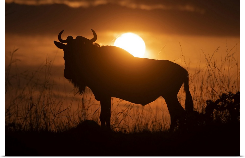 <p>Silhouette of blue wildebeest (Connochaetes taurinus) against sunset sky, Cottar's 1920s Safari Camp, Maasai Mara National Reserve; Kenya</p>