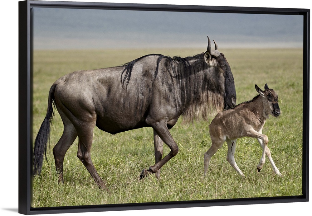 <p>Blue wildebeest (brindled gnu) (Connochaetes taurinus) cow and days-old calf running, Ngorongoro Crater, Tanzania, East Africa, Africa.</p>