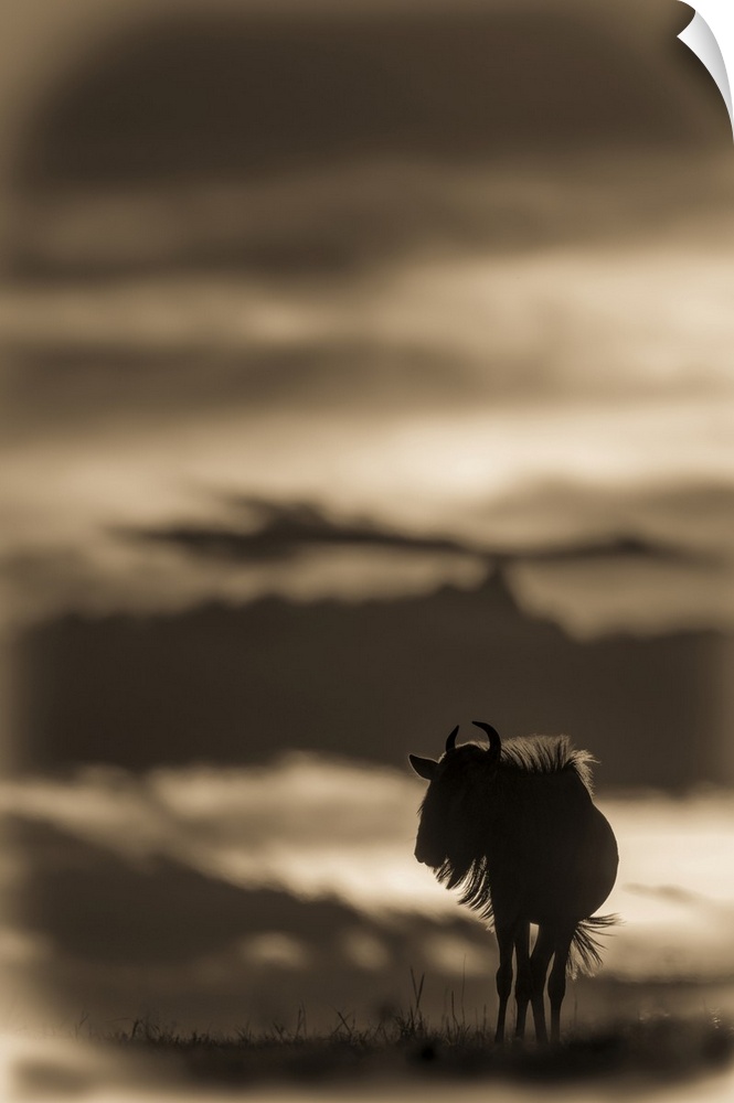 <p>A blue wildebeest (Connochaetes taurinus) on the horizon is silhouetted against a yellow and black sky at sunset. Its horns are visible in outline, and it's standing with its head turned in Klein's Camp, Serengeti National Park; Tanzania</p>
