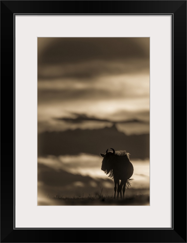 <p>A blue wildebeest (Connochaetes taurinus) on the horizon is silhouetted against a yellow and black sky at sunset. Its horns are visible in outline, and it's standing with its head turned in Klein's Camp, Serengeti National Park; Tanzania</p>