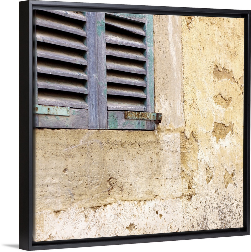 <p>Window with closed wooden blue shutters in rustic cement wall.</p>