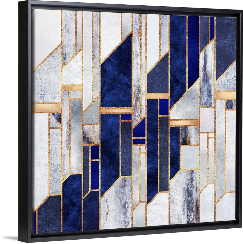 <p>A contemporary, geometric, art deco design in shades of grey and blue. The shapes are outlined in gold.</p>