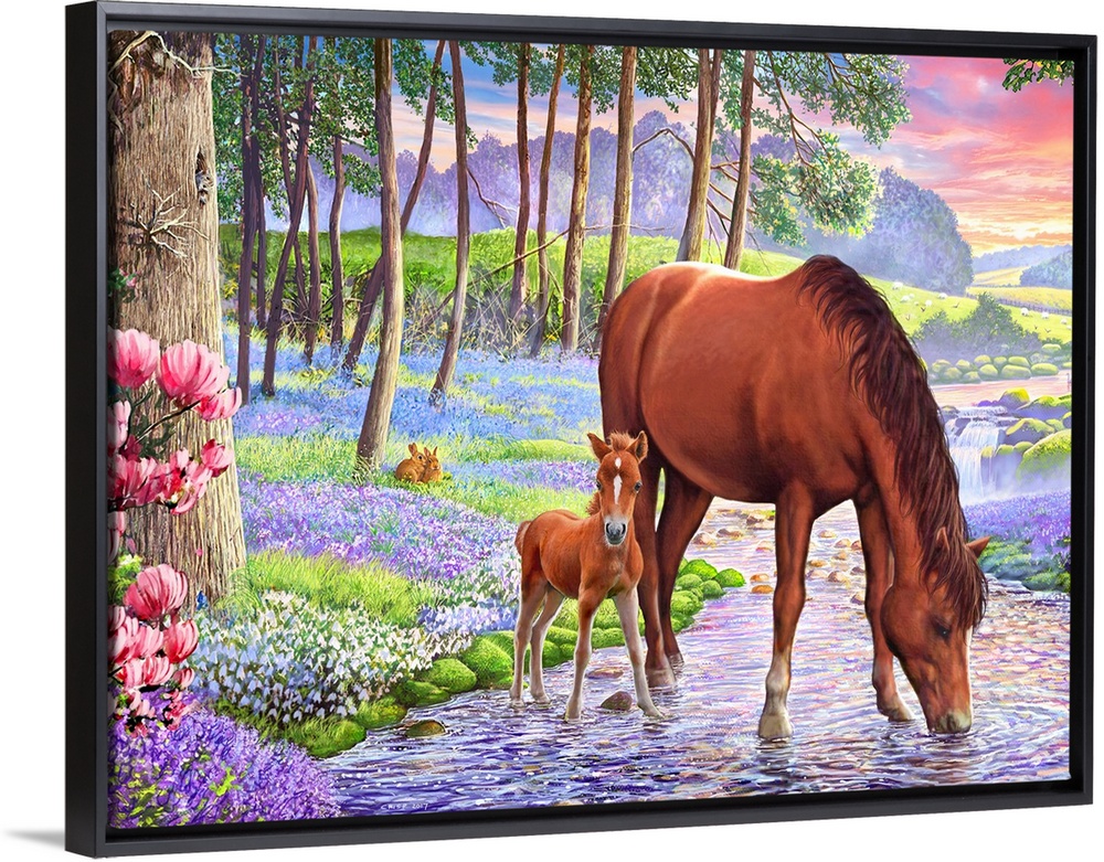 <p>Mare and Foal in a stream running through a bluebell wood.</p>