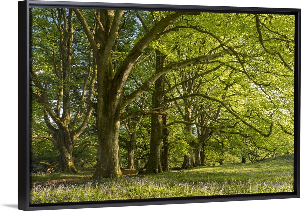 <p>Bluebells and spring green foliage in a beech woodland, Dartmoor, Devon, England. Spring, May, 2016.</p>
