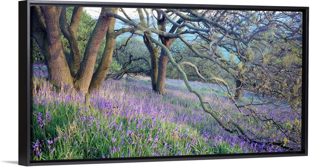 <p>Panoramic photo of bluebell flowers sprinkled through the countryside in the midst of forked trees.</p>