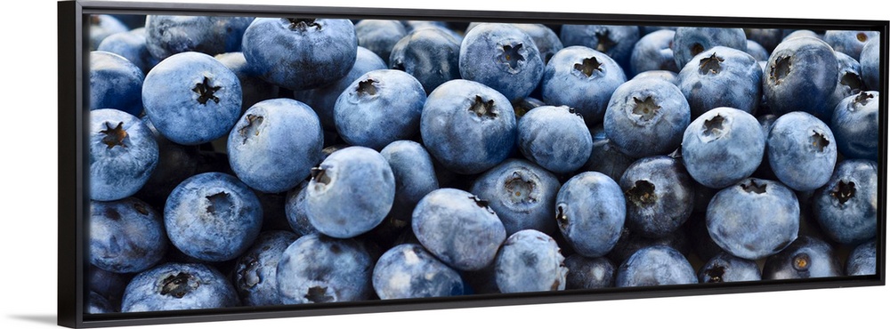 <p>Big panoramic up close view of blueberries on canvas.</p>