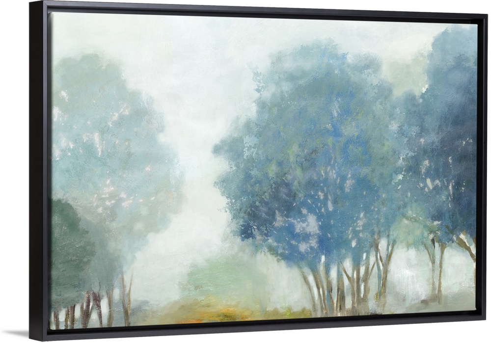 <p>Contemporary artwork of a misty valley with blue trees.</p>