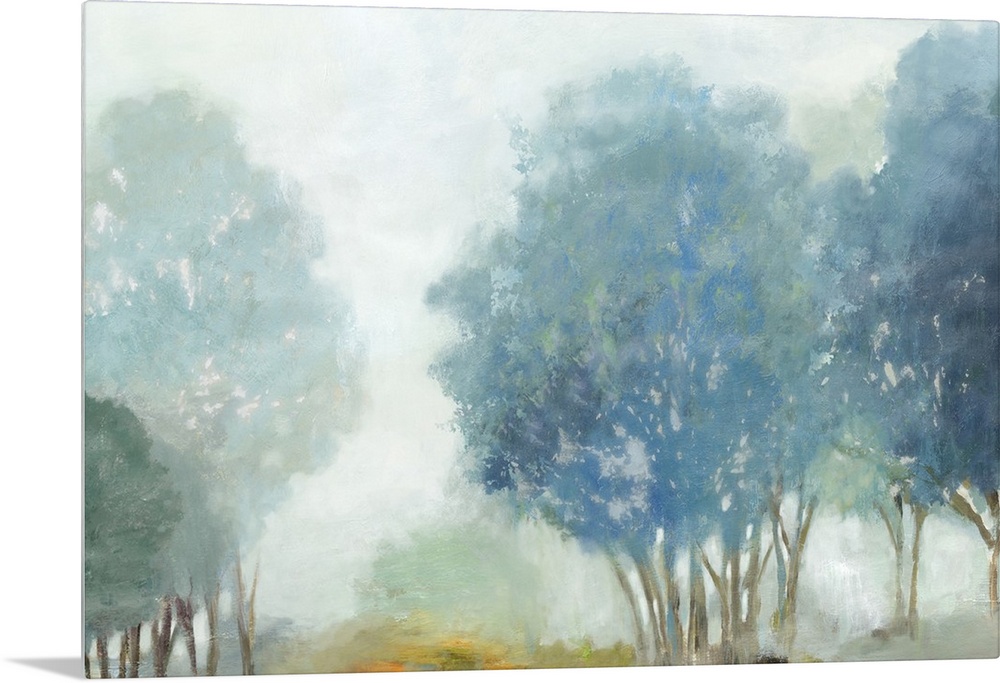 <p>Contemporary artwork of a misty valley with blue trees.</p>