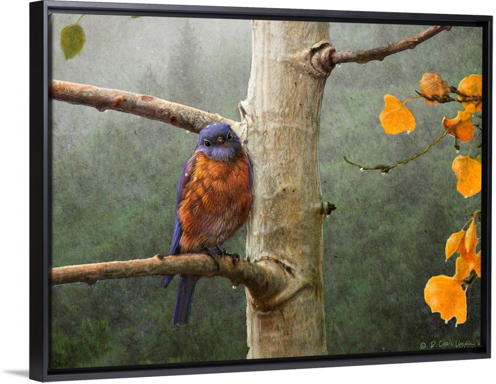 <p>Painting of a blue bird sitting on a tree branch with a dense and foggy forest in the background printed on canvas.</p>
