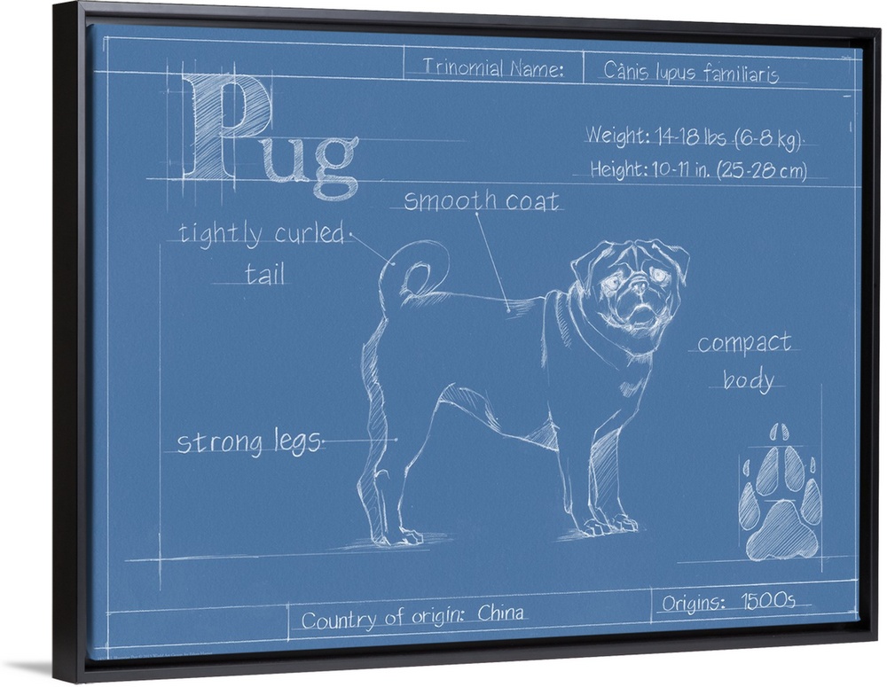 <p>"Blueprint" illustration showing the parts of a Pug dog.</p>