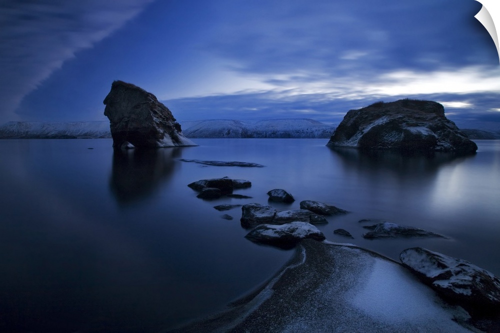 <p>Rock formations off the coast with a mountain range in the distance, Iceland.</p>