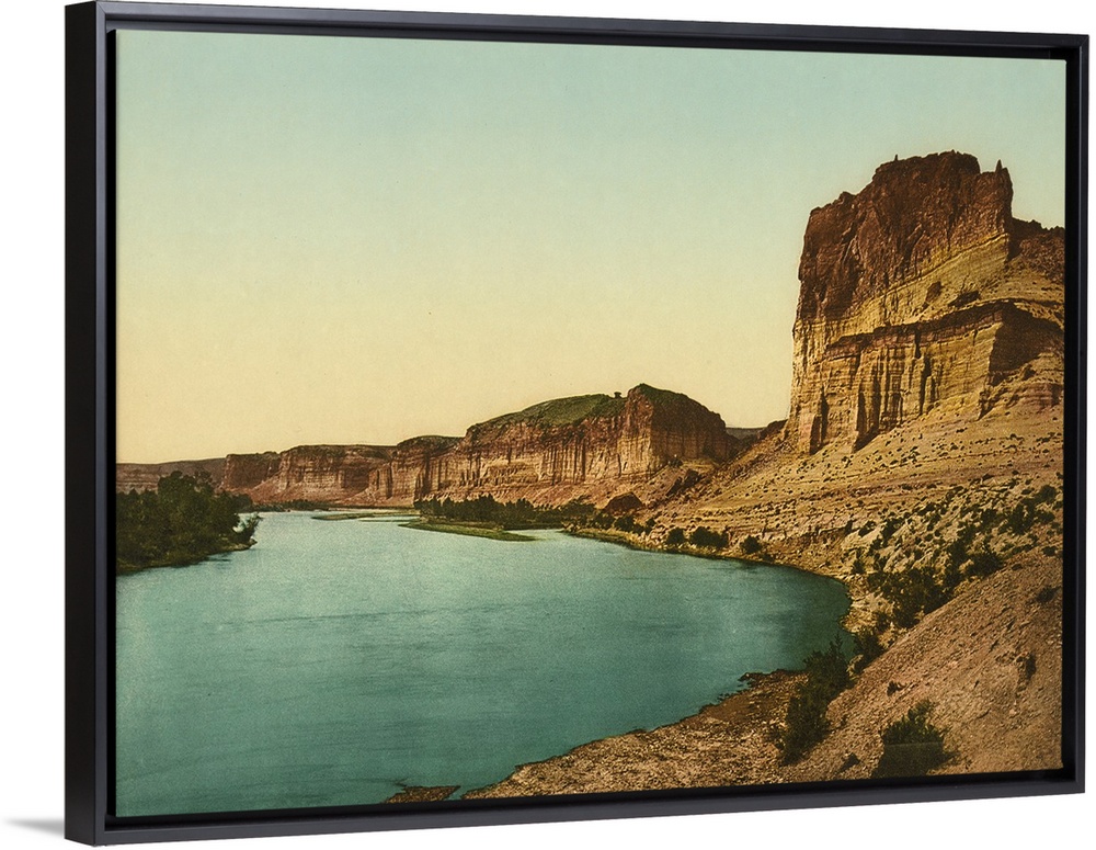<p>Hand colored photograph of bluffs of the green river.</p>