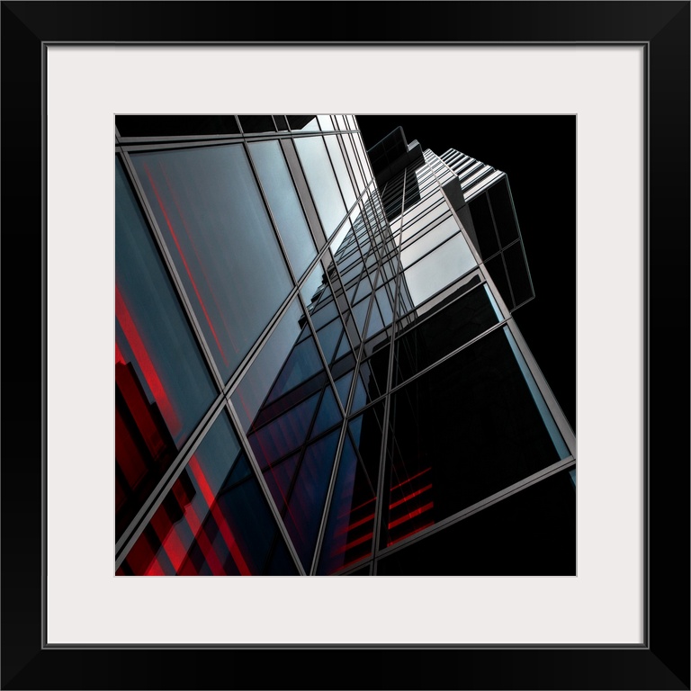 <p>Looking up at geometric skyscrapers against a dark sky.</p>