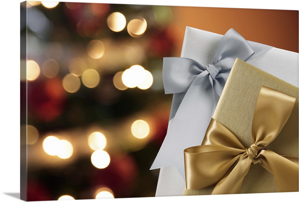 <p>Christmas tree which has been shot blurred. The lights of the tree have been lit. The background of the photograph is light brown. There are two presents placed in the foreground ot the photograph. The presents have been very nice and they have been decorated with nice bows. Indoors shot, horizontal frame.</p>