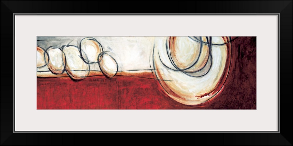 <p>Contemporary abstract painting using bright red and clashing with a dirty gray, while bold lines create organic shapes.</p>
