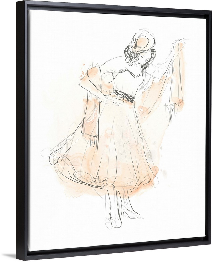 <p>Artistic drawing of a fashionable woman in a dress with light watercolor accents in blush.</p>