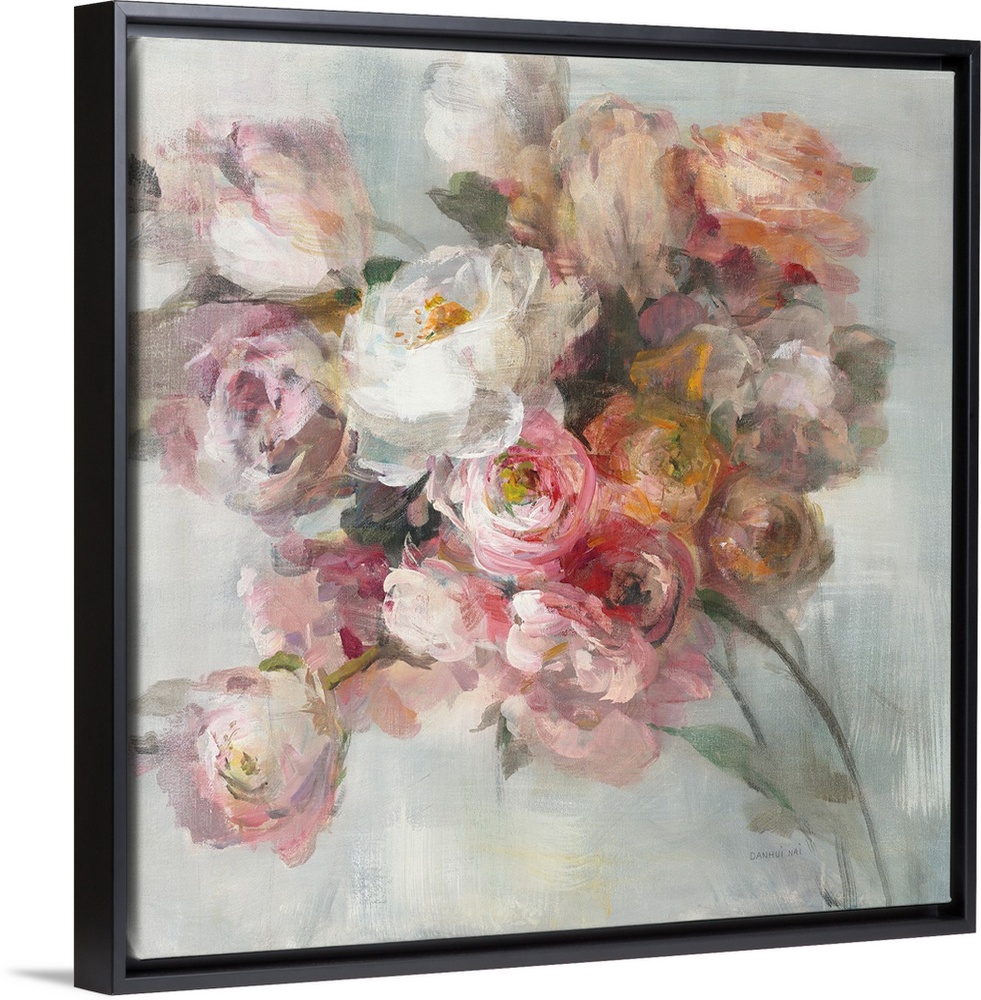 <p>Soft delicate brush strokes create a bouquet of warm colored flowers in this contemporary artwork.</p>