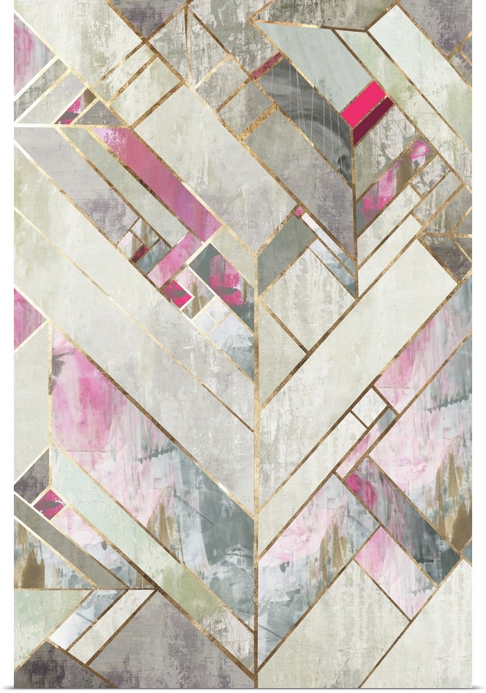 <p>An art deco design of neutral colors with accents of pastel colors in geometric shapes.</p>