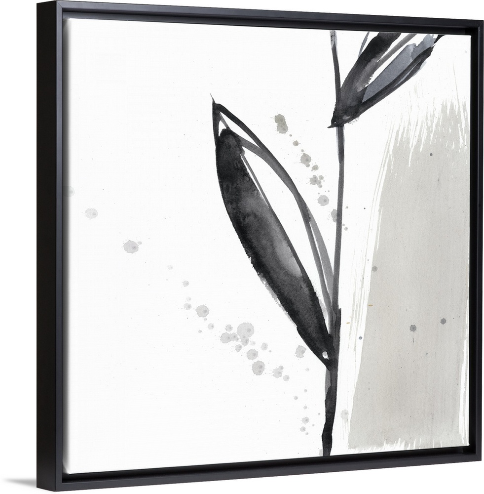 <p>Square watercolor abstract of a flower stem and leaves with overlapping spatters of paint on a white background.</p>