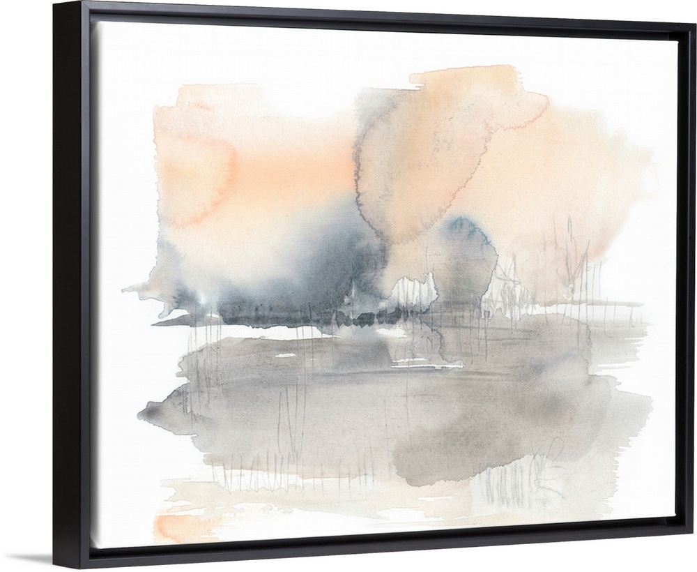 <p>A light, watercolor abstract in shades of peach and grey is reminiscent of a landscape.</p>