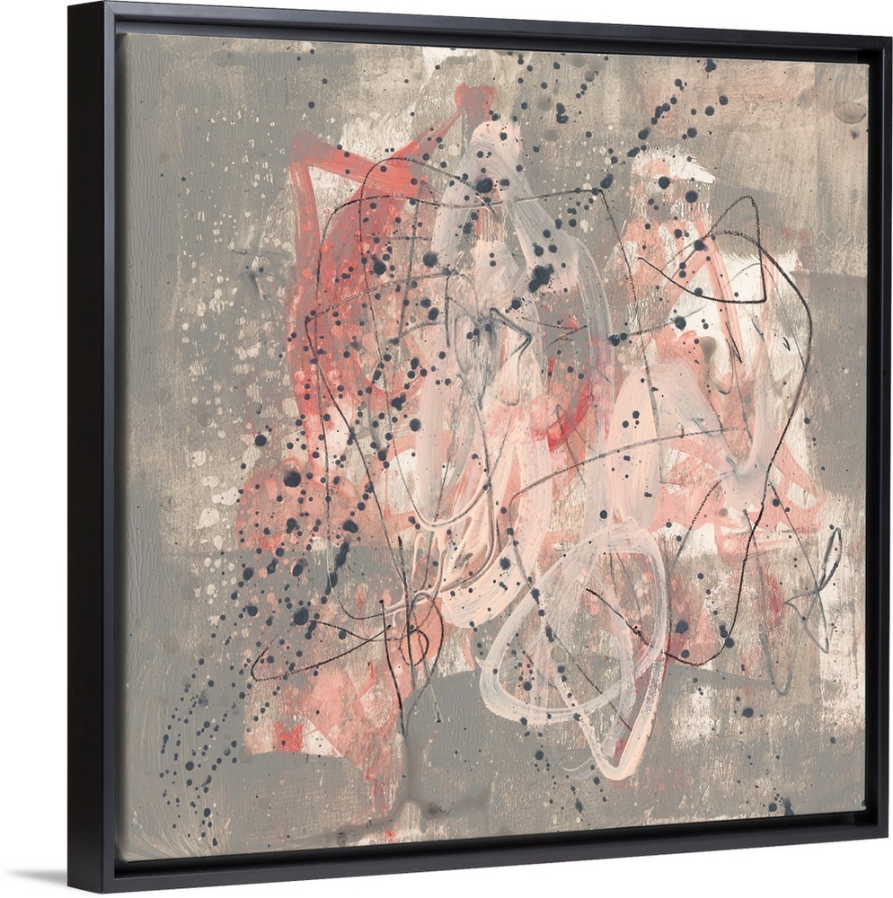 <p>Untamed brush strokes in shades of pink overlap blocks of gray color adorned with splatters and gestural mark making lines in this abstract artwork.</p>