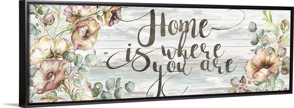 <p>"Home is where you are" with poppy and eucalyptus in subdue tones on a wood backdrop.</p>